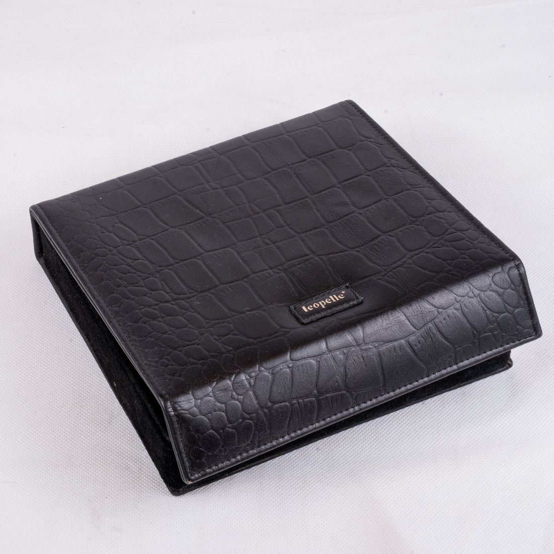 A square tissue box cover made from embossed leather on the front and Nubuck leather...