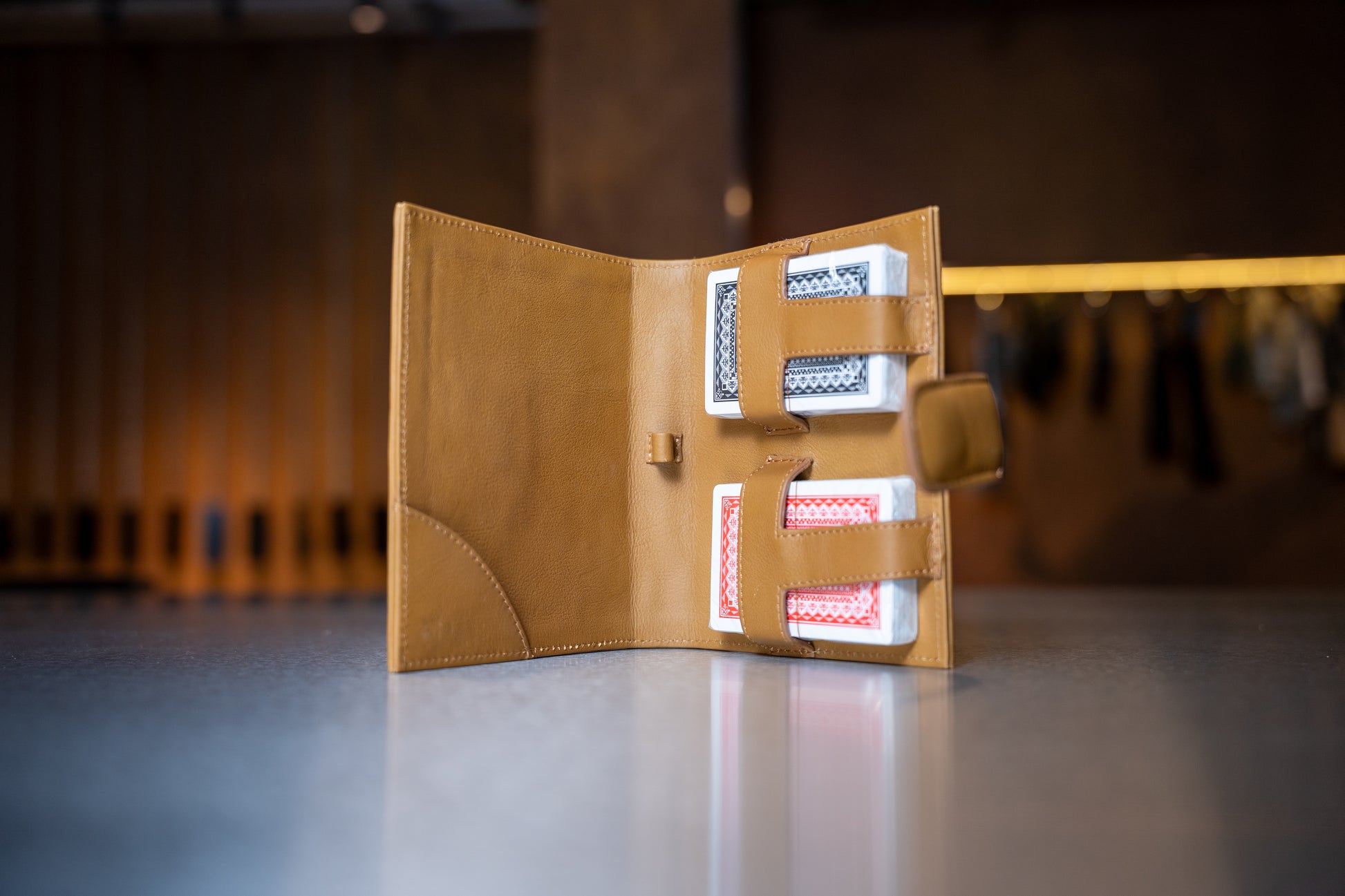 A sophisticated leather case designed to hold two decks of playing cards. Crafted with precision and elegance, it combines functional luxury with a timeless aesthetic. The structured design keeps the cards organized and protected, while the secure closure ensures effortless portability. Perfect for card game enthusiasts who value refined craftsmanship and elegant presentation in every detail.