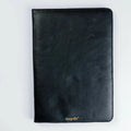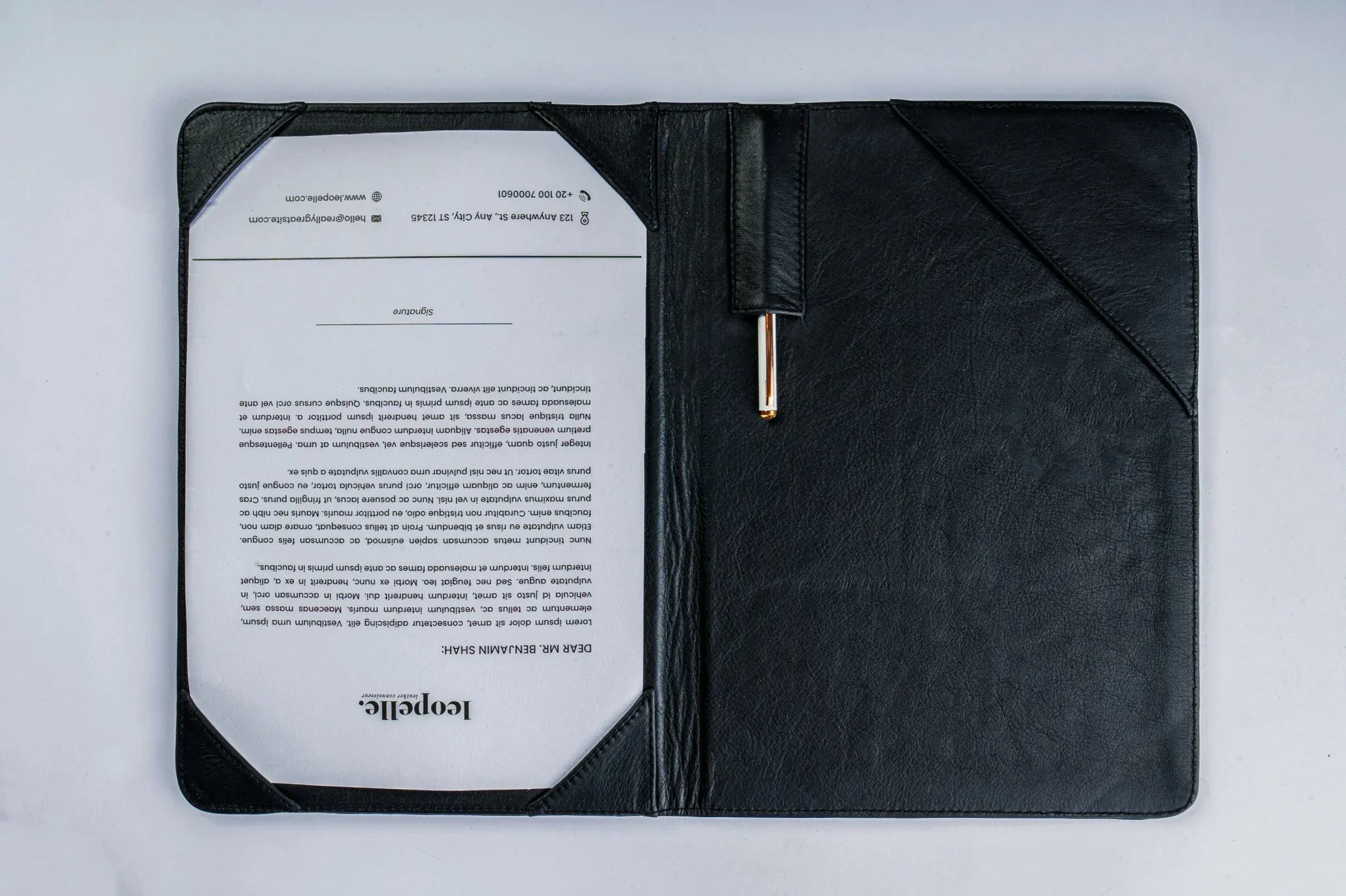 A contract folder is all genuine, giving a professional look when signing any contract. Acts as a special gesture for any company and can be embossed with your company's logo. On the left side is a place for a pen loop and business card slots. You can put papers behind this flap. On the right side there are four corners and behind this corners you can put A4 paper.